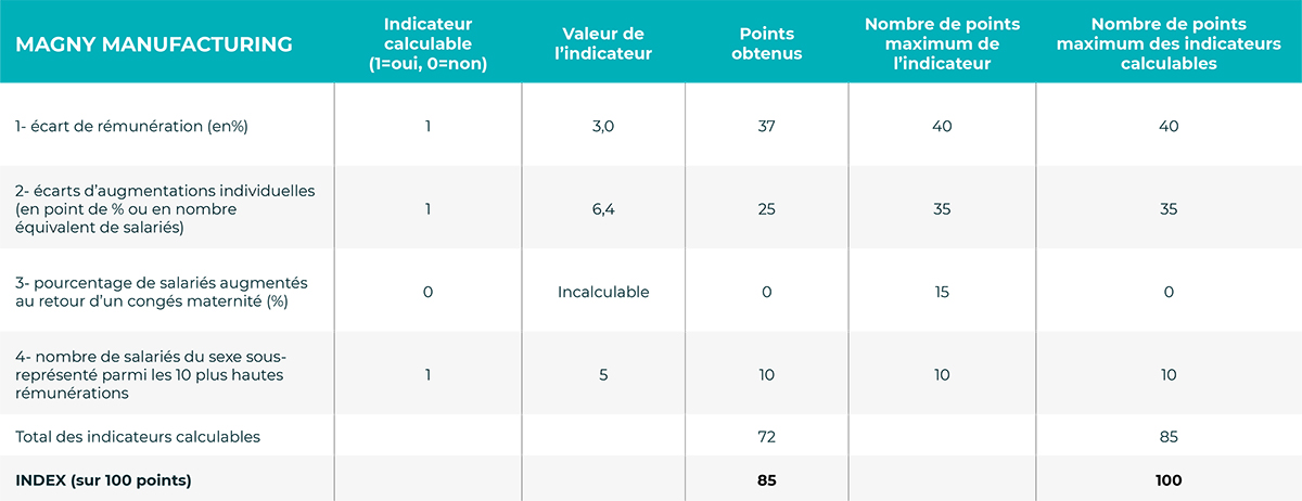 L’index sur l’égalité professionnelle entre les femmes et les hommes est une note sur 100, obtenue à partir de 5 indicateurs :
